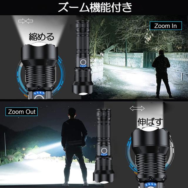 【10000 高ルーメン懐中電灯】耐久性のあるLEDチップ使用、最大ビーム距離500メートル (1640フィート) 、部屋全体を簡単に照らしたり、最大1600フィート離れたところの物に焦点を当てたりできます。 長距離観測に適した強烈スポットライト。【5つの照明モード & 調節可能なフォーカス】5つの照明モードを備えた高ルーメン懐中電灯: 強/中/低/点滅/SOS、ズーム可能な懐中電灯でズーム可能な光を実現し、広い範囲の投光器やスポットライトを発します。 安全で信頼性が高く、使いやすいです。 キャンプ、登山、ハイキングなどに最適な懐中電灯です。