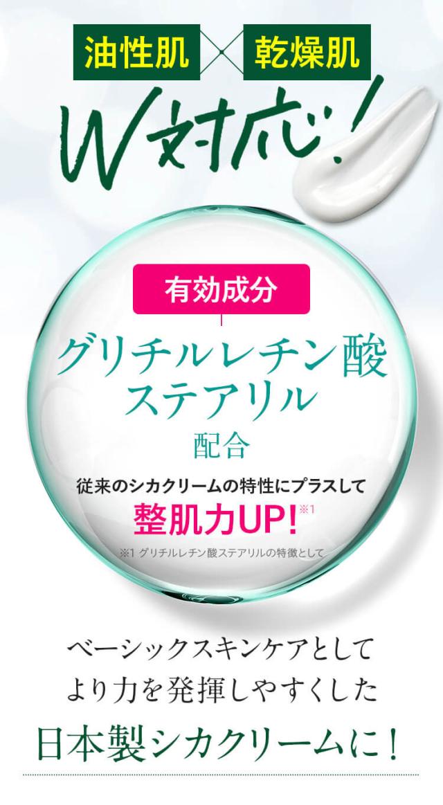 有効成分:グリチルレチン酸ステアリル その他成分:精製水、1,2-ヘキサンジオール・1,2-オクタンジオール混合物、1,2-ペンタンジオール、1,3-ブチレングリコール、アラキルグルコシド・アラキルアルコール・ベヘニルアルコール、イノシット、カルボキシビニルポリマー、グリセリンモノ2-エチルヘキシルエーテル、サクラ葉抽出液、シア脂、自己乳化型モノステアリン酸グリセリル、シソエキス(1)、親油型モノステアリン酸グリセリル、水酸化カリウム、ステアリン酸、ツボクサエキス、天然ビタミンE、ドクダミエキス、トリ(カプリル・カプリン酸)グリセリル、濃グリセリン、ベヘニルアルコール、メチルポリシロキサン、ヨクイニンエキス、d-δ-トコフェロール
