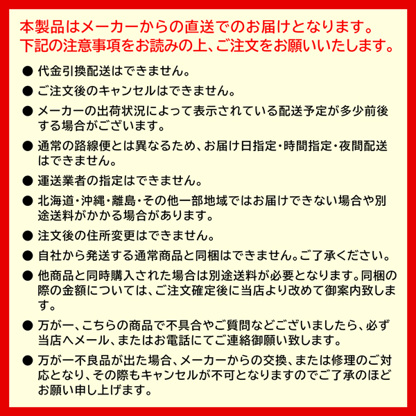 | 本製品はメーカーからの直送でのお届けとなります。 ● 下記の注意事項をよくご確認の上、ご注文をお願いいたします。 ● 代金引換配送はできません。 ● ご注文後のキャンセルはできません。 ● メーカーの出荷状況によって表示されている配送予定が多少前後する場合がございます。 ● 通常の路線便とは異なるため、お届け日指定・時間指定・夜間配送はできません。 ● 運送業者の指定はできません。 ● 北海道・沖縄・離島・その他一部地域ではお届けできない場合や別途送料がかかる場合があります。 ● 注文後の住所変更はできません。 ● 自社から発送する通常商品と同梱はできません。ご了承ください。 ● 他商品と同時購入された場合は別途送料が必要となります。同梱の際の金額については、ご注文確定後に当店より改めて御案内致します。 ● 万が一、こちらの商品で不具合やご質問などございましたら、必ず当店へメール、またはお電話にてご連絡御願い致します。 ● 万が一不良品が出た場合、メーカーからの交換、または修理のご対応となり、その際もキャンセルが不可となりますのでご了承のほどお願い申し上げます。 |