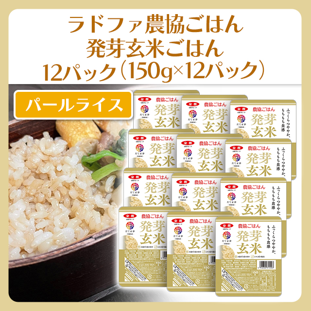 商品名 ラドファ農協発芽玄米ごはん 12パック(150g×12パック) パールライス 容量 150g×12個 原材料名 うるち米(宮城県産) アレルギー特定原材料 ー 賞味期限 商品の発送時点で、121日以上あるものをお届けいたします 保存方法 直射日光、高温多湿を避けて保存 お召し上がり方 ・電子レンジで温める場合…500W・600W約2分
