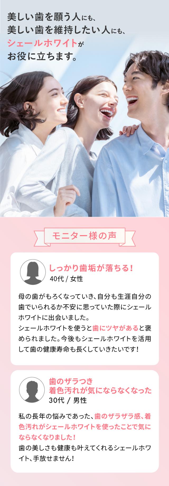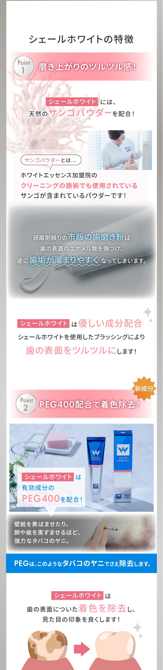 | シェールホワイト 成分 | 湿潤剤:ソルビット液、濃グリセリン、レモンエキス/清掃剤:炭酸カルシウム、サン ゴ未焼成カルシウム未/溶剤:精製水、エタノール/粘度調整剤:無 水ケイ酸/有効成分:ポリエチレングリコール400、ゼオライト、モノフルオロリン酸ナトリウム(フッ素)、/粘結剤:カルボキシメチルセル ロースナトリウム/甘味剤:キシリット、サッカリンナトリウム/発泡 剤:ラウリル開酸ナトリウム/香味 剤:香料(アプリコットミントタイプ) /清涼剤:I-メントール/洗浄剤: ポリリン酸ナトリウム |