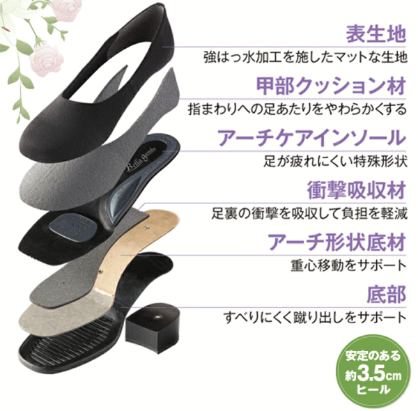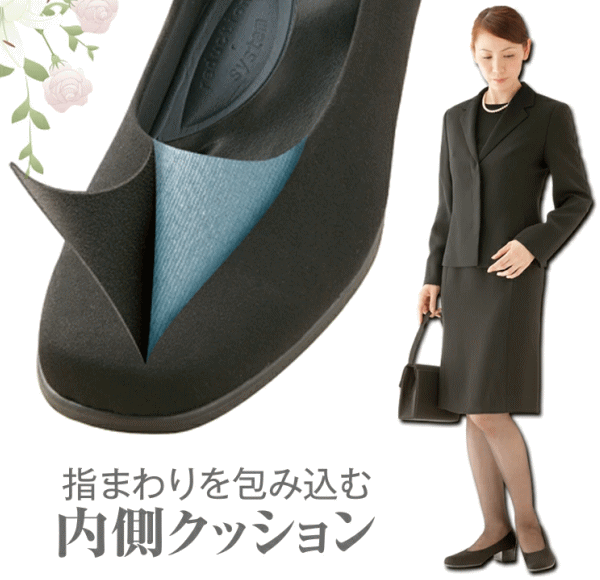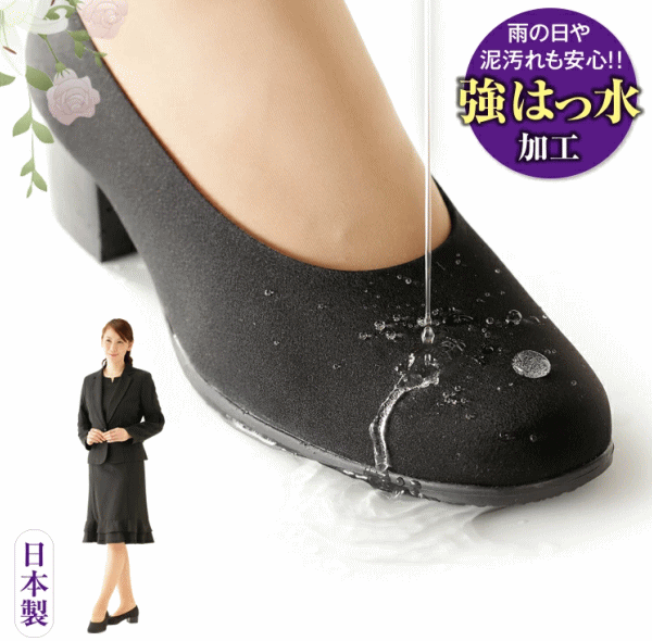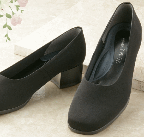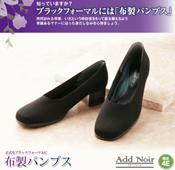 知っていますか?ブラックフォーマルには「布製パンプス」。強撥水の生地を使用した布製のパンプス。足幅4Eでゆったりめ。外反母趾の方も足先が痛くなりにくい。疲れ・かかとのズレを軽減するこだわりの特殊アーチインソール。足裏の凹凸にフィットしたクッション性の高い中敷きで偏平足・外反母趾・タコなどのトラブルもケア。足先の回りをクッション材が包み込み履き心地も優しい。3.5cmのローヒールで歩きやすい。撥水生地なので雨の日でも安心。汚れが付きにくいのでお手入れが簡単です。■サイズ22.5cm、23.0cm、23.5cm、24.0cm、24.5cm■材質[甲部]ポリエステル[中敷き]合成皮革・EVA樹脂[底部]合成ゴム■カラー:ブラック■生産国:日本製