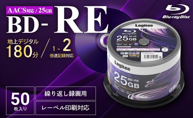 ロジテック BD-RE 50枚入り 2セット AACS対応 ブルーレイディスク Blu-ray Disc 2倍速 くり返し録画用 記録用 25GB 記録メディア スピンドルケース 【LM-BRE25VWS50W】