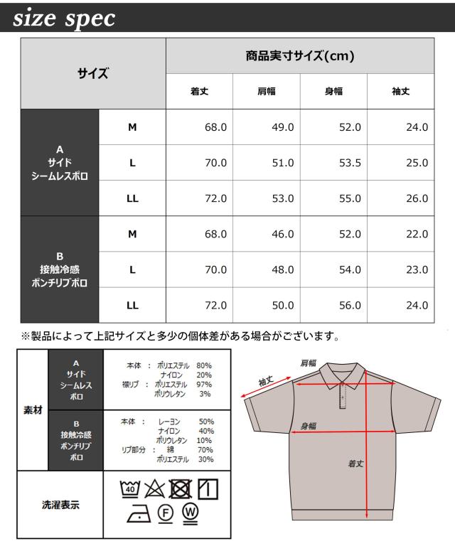 | 素材 | A 本体:ポリエステル 80% ナイロン 20% 衿リブ:ポリエステル 97% ポリウレタン 3% B 本体:レーヨン 50% ナイロン 40% ポリウレタン 10% リブ部分:綿 70% ポリエステル 30% |