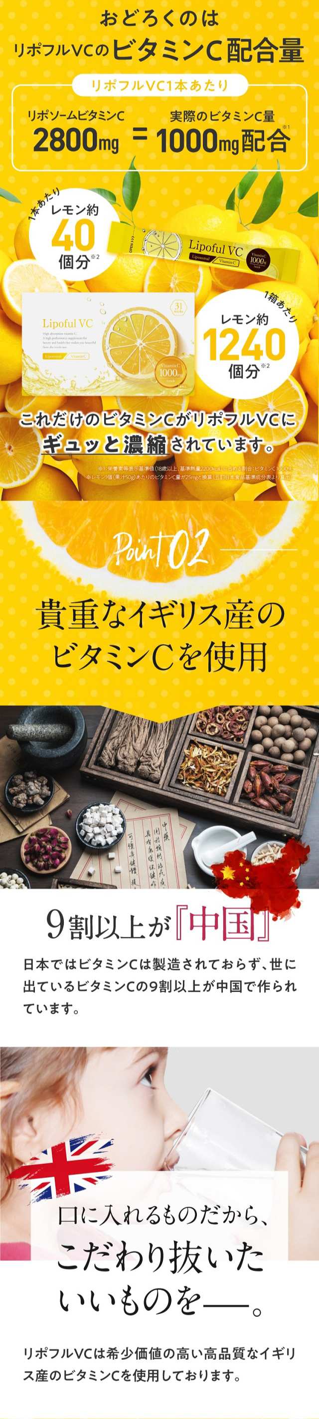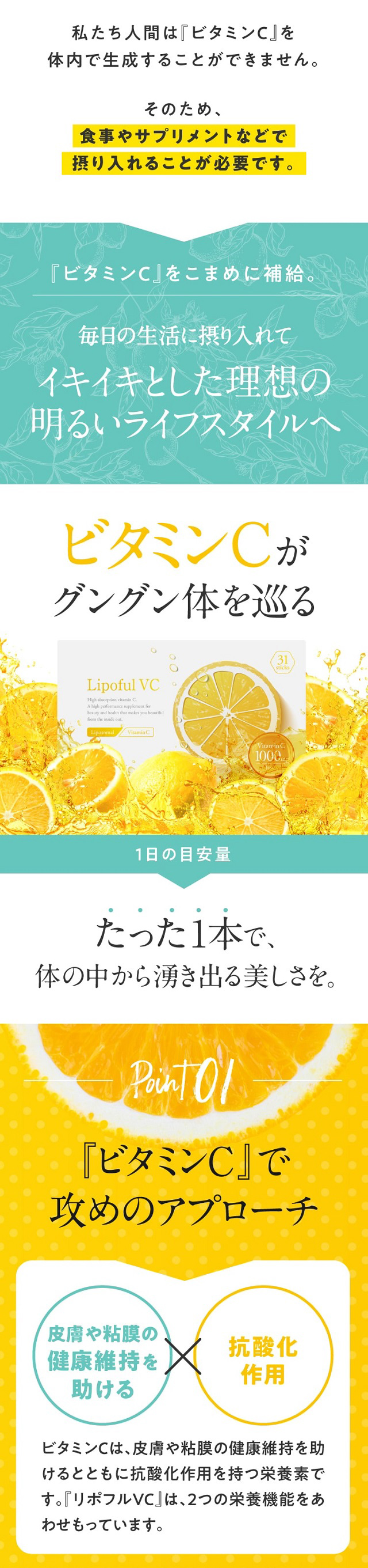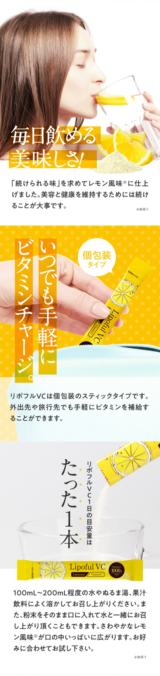 | 特徴 | リポソームビタミンC 100%!希少価値の高い、高品質なイギリス産のビタミンCを使用! リポソームビタミンC 2800mg(*1) = 実際のビタミンC量 1000mg(*1)配合した粉末タイプのビタミンCサプリメントです。 リポフルVCは栄養機能食品認定「ビタミンCは、皮膚や粘膜の健康維持を助けるとともに、抗酸化作用を持つ栄養素です。」 リポフルVCには、1本あたりレモン約40個分(*2)、1箱でレモン約1240個分(*2)のビタミンCがぎゅっと濃縮されています。 さらに、口に入れるものだからこそ、ビタミンCはこだわり抜いたいいものを。 リポフルVCは希少価値の高い高品質なイギリス産のビタミンCを使用しております。 そのビタミンCをより効率よく吸収するために、リポソーム技術を採用しました。 リポソームとは、リン脂質の2重膜構造をもったナノサイズのカプセルのことです。人間の細胞膜と同じ成分「リン脂質」作られたGMPグレードのカプセルです。 人の細胞(腸上皮細胞 約30μm)の約300分の1である100nm〜300nmと極めて小さい為、ビタミンCを体の隅々まで運べるのが特徴です。 さらに、ビタミンCを100%リポソーム化。ビタミンCをナノサイズのカプセルに閉じ込めることでビタミンCを守り、栄養機能はそのままに、効率よくダイレクトに届けます。 リポフルVCは安心・安全のサプリメントです。 【1】美容のプロ、ドクターによる監修 【2】医薬品GMPグレードの高品質なレシチンを使用してリポソーム化 【3】GMP認定工場での国内製造 【4】遺伝子組み換えフリー 【5】アルコールフリー 毎日飲める美味しさ、「続けられる味」を求めてレモン風味(*3)に仕上げました。 また、個包装なので外出先や旅行先など、いつでも手軽にビタミンを補給することができます。 (*1)1本あたり (*2)レモン1個(果汁50g)あたりのビタミンC量が25mgと換算(五訂日本食品標準成分表より算出) (*3)無果汁 ※本品は、特定保健用食品と異なり、消費者庁長官による個別審査を受けたものではありません。 ※1日当たりの摂取目安量に含まれる機能に関する表示を行っている栄養成分の量が栄養素等表示基準値(18歳以上、基準熱量2200kcal)に占める割合:ビタミンC 1000% |