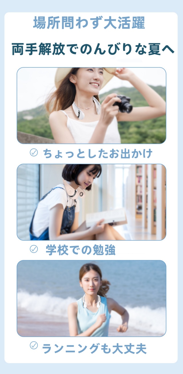 ネッククーラーと首掛け扇風機のぶつかり合い、「エアコン」を携帯するような、いつでもどこでも涼しさが満喫できます。