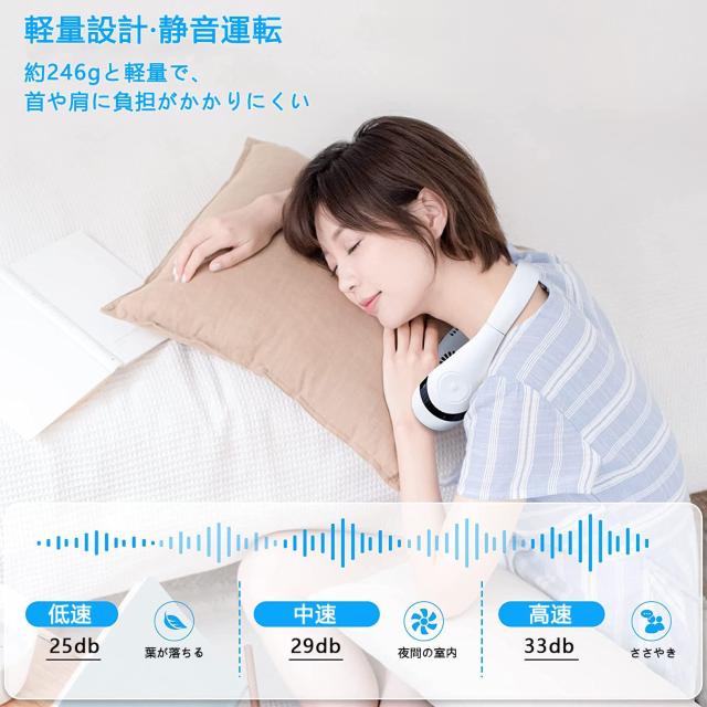 - 首にかけてても気にならない重さ。軽いのに作りはしっかりしています。見た目も高級感があってよいです。3段階の風量調整がついてます。1段階でも十分涼しい、本体もヒンヤリして首を冷やしてくれます。音も気にな...