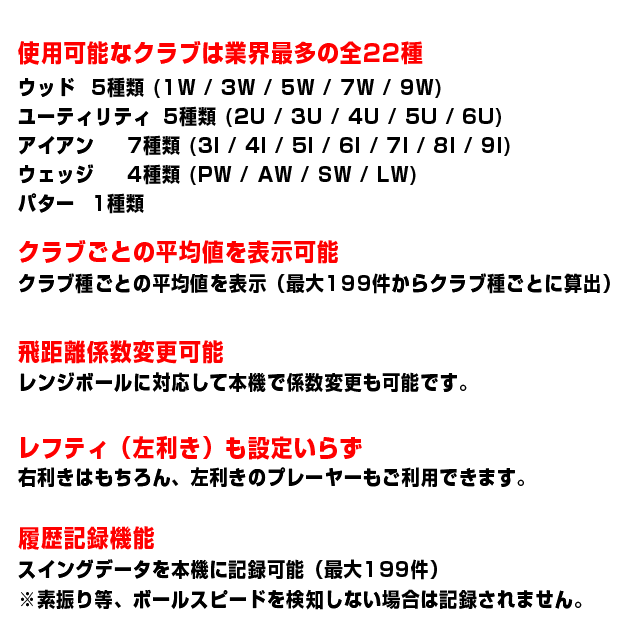 | ボールスピード表示範囲 | ウッド/ユーティリティ/アイアン/ウェッジ |