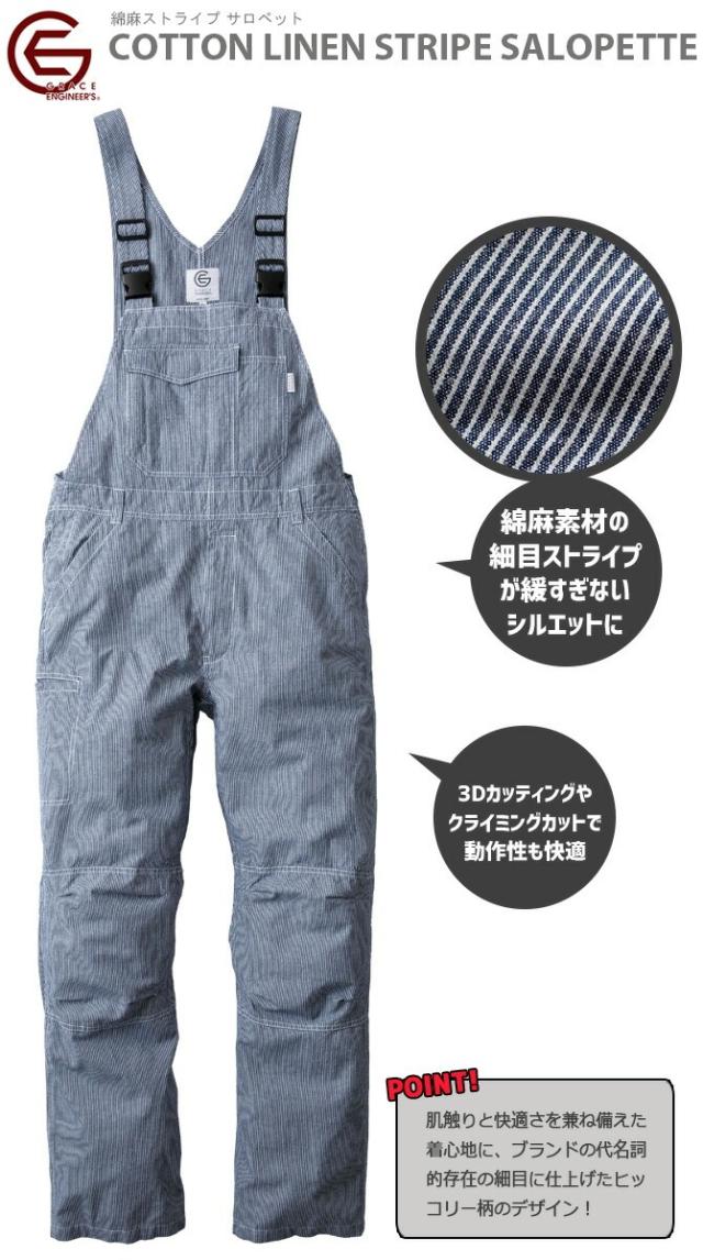 綿麻ストライプサロペット GE-584 グレイスエンジニアーズ 春夏用 メンズ レディース SKプロダクト リネン コットン ヒッコリー サロペット ワーク 作業服 作業着