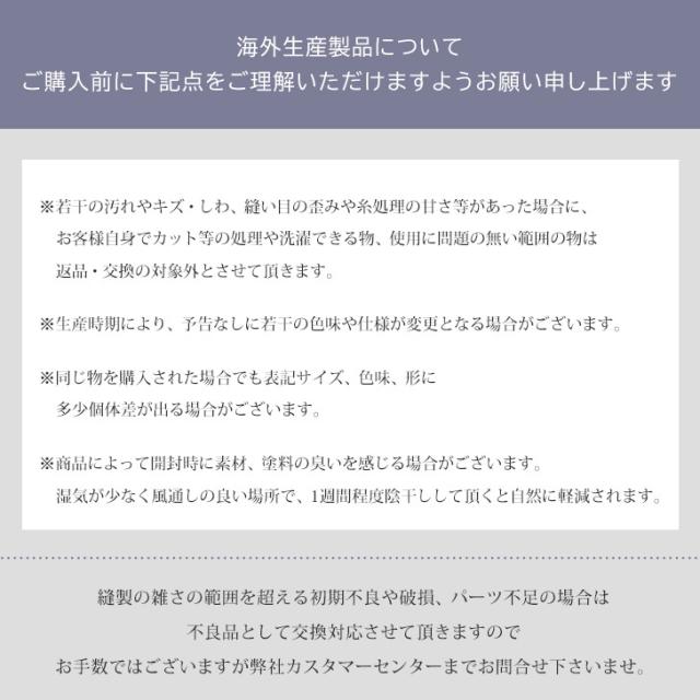 ■注意事項:商品の開封時に素材の臭いを感じる場合がございます。湿気が少なく風通しの良い場所で、一週間程度陰干しして頂くと自然に軽減されます。