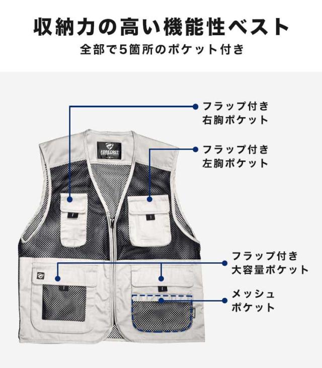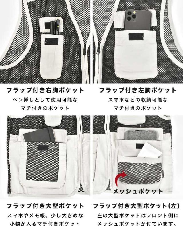 小物の収納に便利なポケットが多数付いた、涼しく動きやすい機能性メッシュベストが登場。 前面、背中に全面と広く使用されたメッシュで風通しが良く、夏場の暑い季節も心地よく着用できます。 生地は吸汗速乾素材を使用いるのでムレを軽減しサラサラした着心地が続きます。 便利な機能が多数付いているので現場や製造などお仕事用にはもちろん、キャンプやカメラなどレジャーシーンでもオススメです。