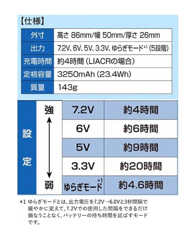 出力:7.2V、6V、5V、3.3V、ゆらぎモード(5段階)