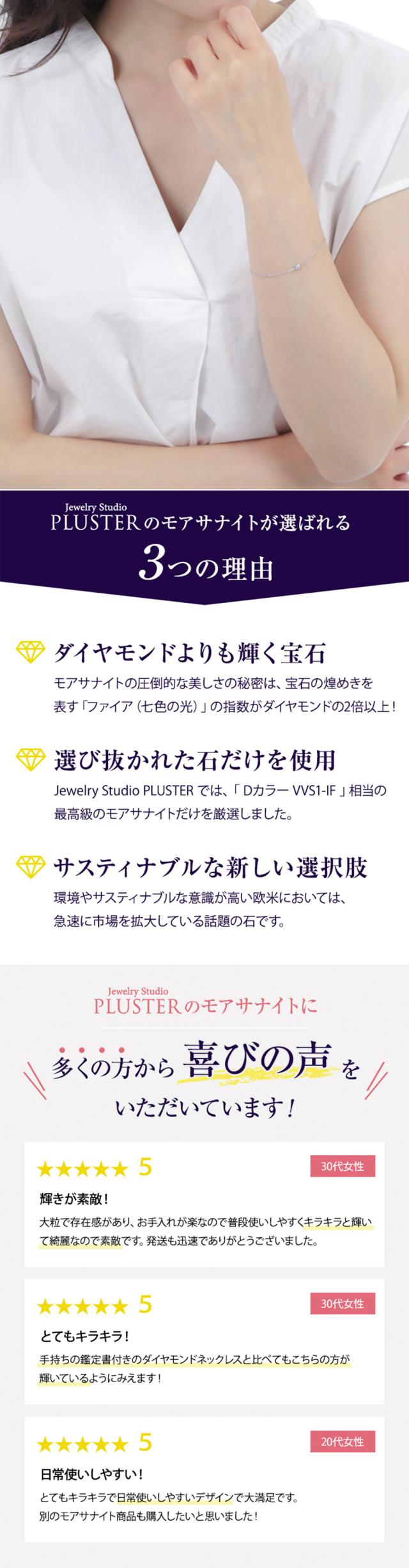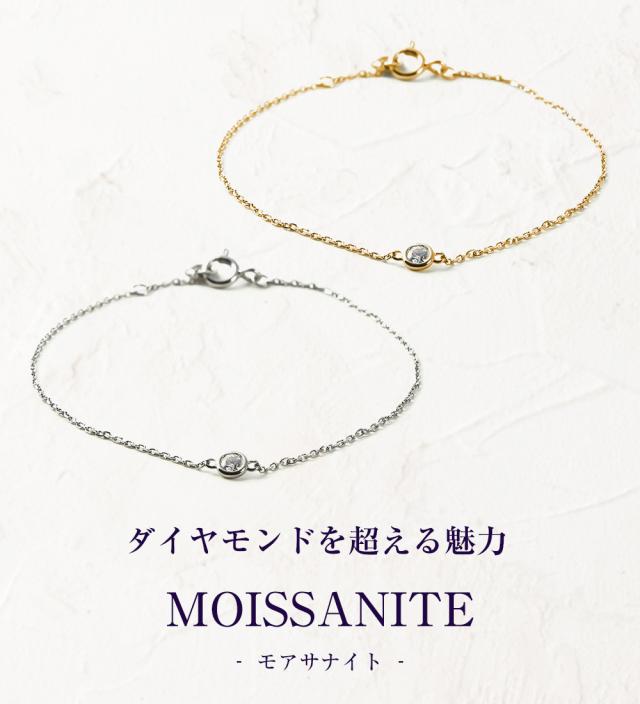 【 MOISSANITE モアサナイト 】 モアサナイトは、隕石の中から発見された鉱物です。ノーベル化学賞を受賞したフランス人化学者のアンリ・モアッサンによって、1893年アメリカのアリゾナ州で発見されました。その硬度と輝きの美しさから、宝石としての価値を見いだされ、最新テクノロジーによって造ることに成功しました。【 光の屈折率(輝きの強さ)や分散(煌めき)がダイヤモンドを越える 】モアサナイトの圧倒的な美しさの秘密は、宝石の煌めきを表す「ファイア(七色の光)」の指数がダイヤモンドの2倍以上あり、輝きを表す「ブリリアンス(強い輝き)」の指数もダイヤモンドを超えることにあります。まさにダイヤモンドに代わる新しい宝石。【 Dカラー VVS1 - IF 相当 】美しいモアサナイトでも、若干の品質の違いがあります。 Dカラー VVS1 - IF 」相当の最高級のモアサナイトだけを厳選しました。更に、モアサナイトは傷つきにくさを表すモース硬度が「9.5」あり、ダイヤモンドの「32」に次いで高く、割れや欠けにくさにつながる強度(耐久性)も非常に優れています。