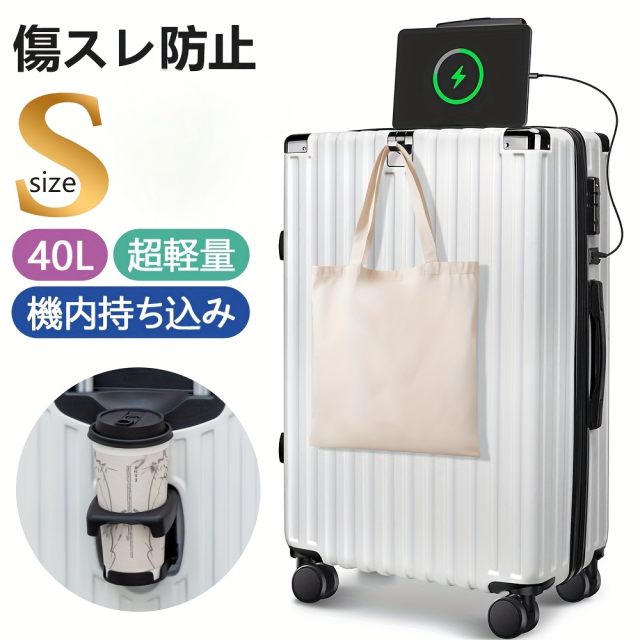 Sサイズ(約20インチ):外寸 56.5×36×22.5cm、重量 2.4KG、容量 約40L(機内持ち込みサイズ)、滞在目安 1〜3日