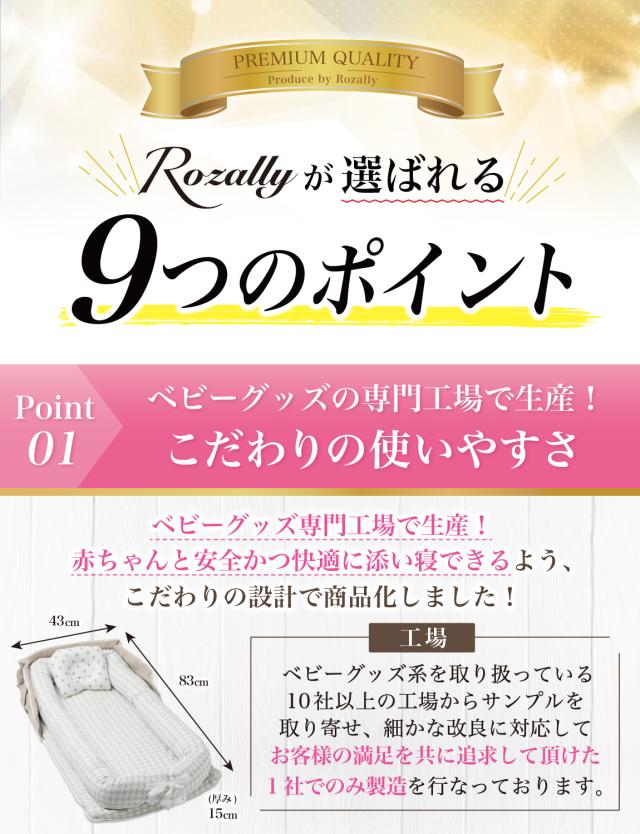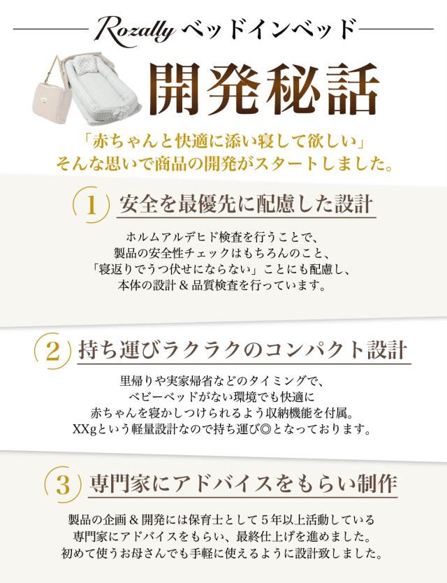 様々なメーカーから 赤ちゃん用 や ベビー用 のお昼寝用品として ” ベッドインベッド ”が販売されていますが、 Rozallyの ベッドインベッド は”こだわり”が一味違います。 乳幼児用ベッド や ベビーベッド の関連製品 など メインに取り扱っている10社以上の工場からサンプルを取り寄せ、 「持ち運び×コンパクト」と「寝返り防止×転落防止」を 一緒に試行錯誤して頂けた1社に絞って発注を行なっています。 製造カラーについても 男の子 女の子 のお好みに合うよう 5カラーにて展開をさせて頂きました。 |
