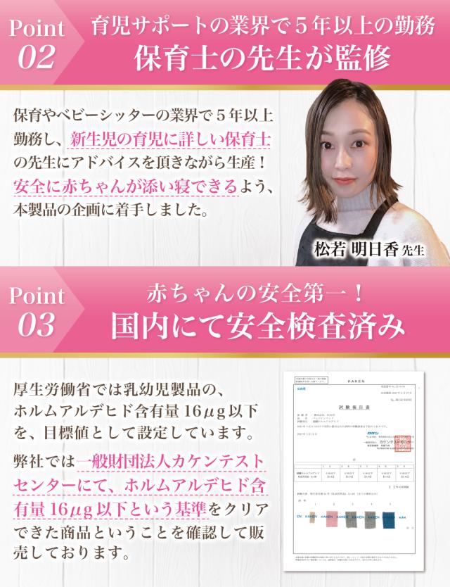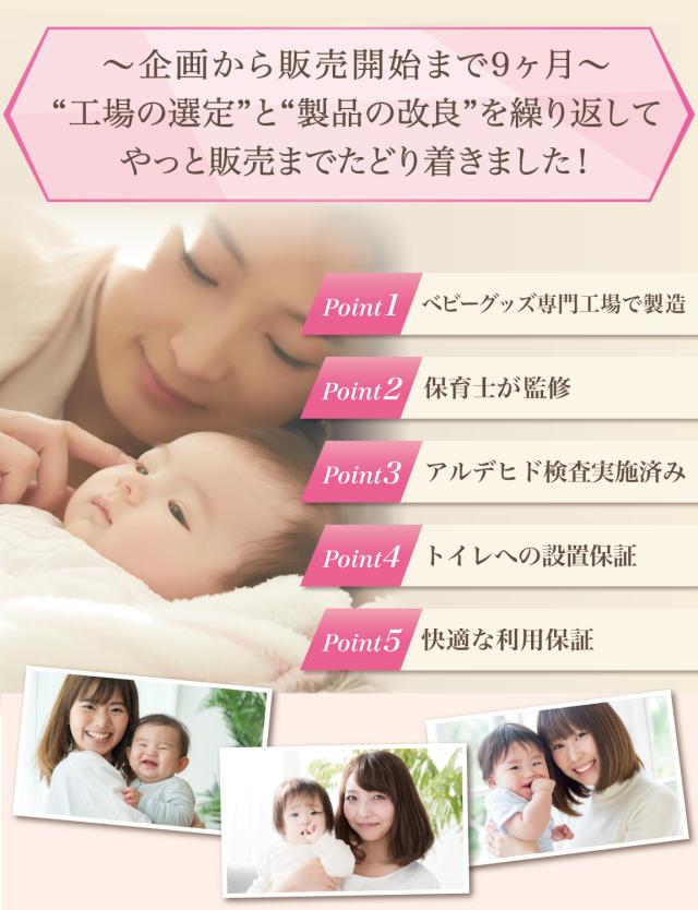 企画&設計では 新生児 や ベビー の育児に詳しい【保育士】の先生からアドバイスをもらい、 折り畳み 方法 や 転落防止 など色々な使用方法を説明書として添えて企画&開発しました。衛生面にも配慮して、通気性 がよく 洗濯可能 なモデルになっています。