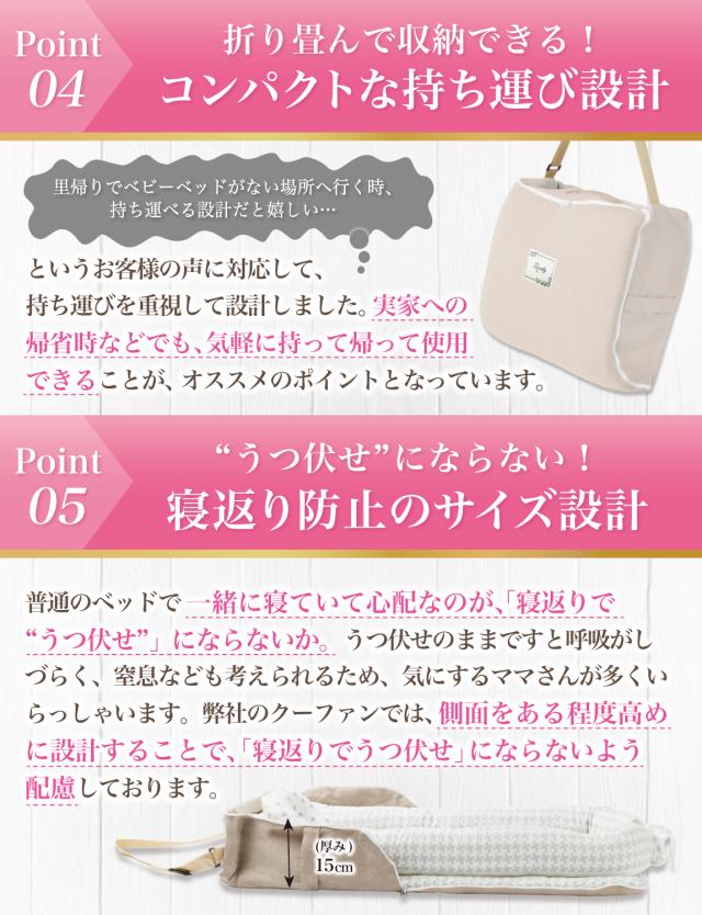 ベビーベッド の中で使用して、 寝返り の 防止はもちろん 乳幼児 がどこでも寝れるように “折りたたみ コンパクト”&”軽量”の 持ち運び設計で企画させて頂きました。