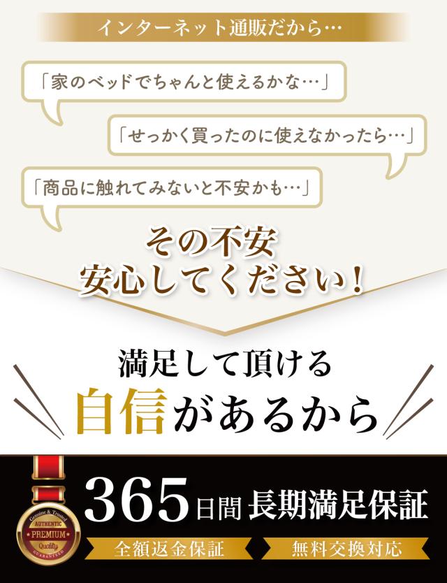 Rozally ベッドインベッドは品質にこだわり、 工場と交渉をおこなって素材選定から進めています。 出荷前の検品などは十分に行わせて頂いているのですが、 輸送中に破損や汚れの付着など稀に発生してしまうケースがあります。 不具合などが発生してしまった場合でも、 製品には1年間の長期保証を付属させて頂いておりますので、 すぐに交換品の手配をさせて頂きます。 また本製品には使いやすさや快適さを実感して頂くことを最優先に考え、 「2週間ほどなかなか上手く使用できなかった」という場合に、 ”開封後”でも”使用済み”でも全額の返金保証を付属させて頂いております。 |