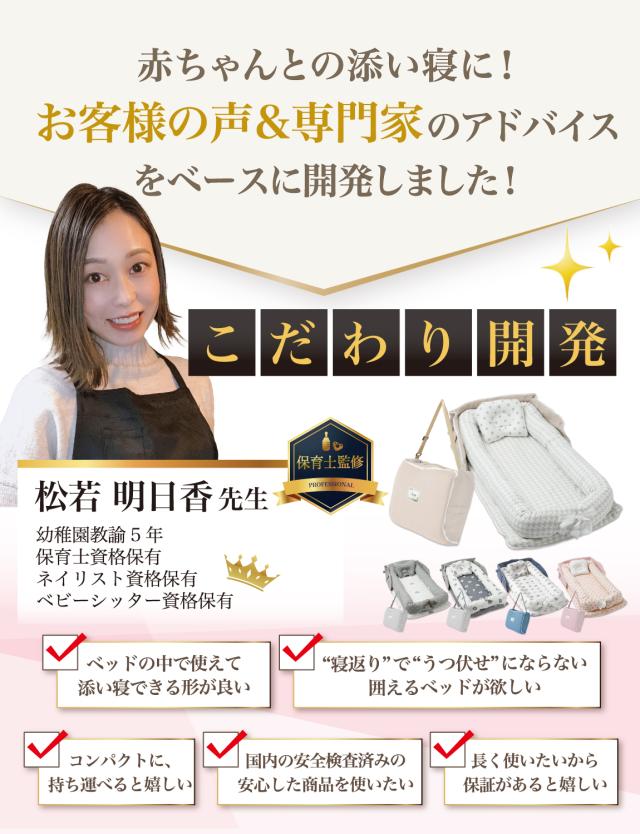 Rozally ベッドインベッド がついに正式販売開始。 赤ちゃん と 添い寝 をする時に 寝返り防止 機能がある ベッドインベッド が欲しい…というお客様の声から生まれた 持ち運び 可能なベットインベットです。 ベビーベッド の中で使用して、 寝返り の 防止はもちろん 乳幼児 がどこでも寝れるように “折りたたみ コンパクト”&”軽量”の 持ち運び設計で企画させて頂きました。 企画&設計では 新生児 や ベビー の育児に詳しい 【保育士】の先生からアドバイスをもらい、 折り畳み 方法 や 転落防止 など 色々な使用方法を説明書として添えて企画&開発しました。 衛生面にも配慮して、通気性 がよく 洗濯可能 なモデルになっています。 |