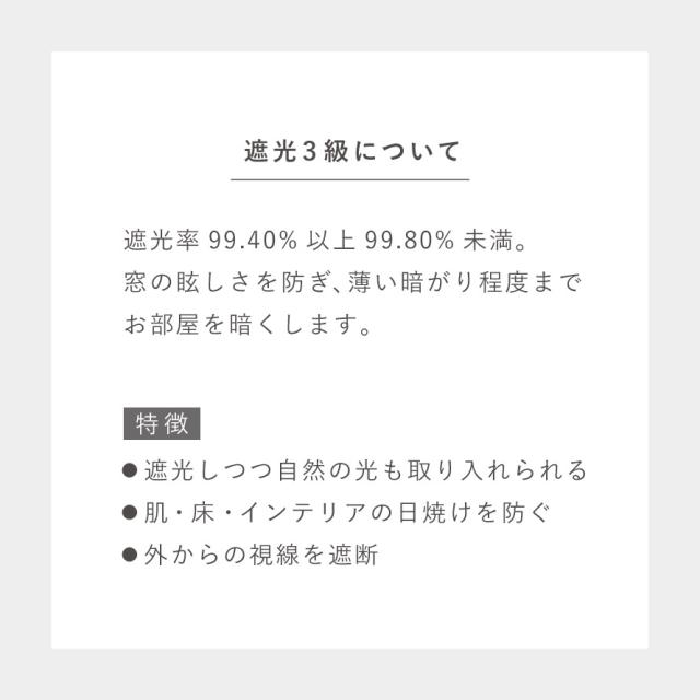 遮光3級(遮光率99.40%以上99.80%未満)で窓のまぶしさを防ぎ、閉めると薄い暗がり程度までお部屋を暗くします。遮光カーテンとしては効果が低いですが、色も柄もバリエーション豊かなデザインのものが多く、外からの光を入れ、デザイン重視のカーテンでお部屋のインテリアを楽しみたい方におすすめです。