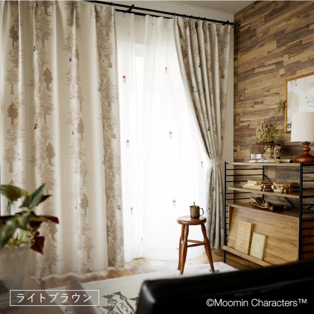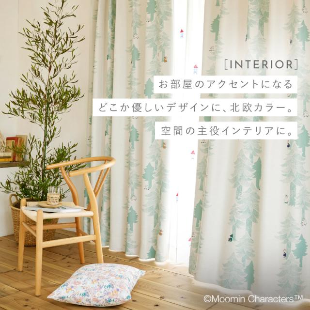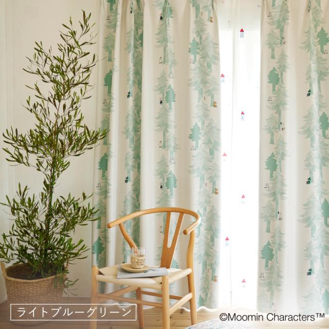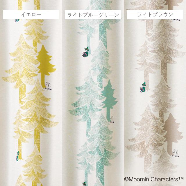 リズミカルに縦に配置された木々、森で暮らすムーミンと仲間たち。お部屋がムーミン谷の様になる、北欧カラーのドレープカーテン。