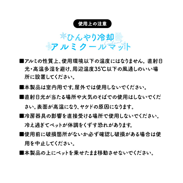 ※輸入品のため、多少の傷や汚れ、歪み等はご了承の上でお買い求めください。※アルミの性質上、使用環境以下の温度にはなりません。直射日光・高温多湿を避け、周辺温度35℃以下の風通しのいい場所に設置してください。※本製品は室内用です。屋外では使用しないでください。※直射日光が当たる場所や火気のそばでの使用はしないでください。表面が高温になり、ヤケドの原因になります。※冷房器具の影響を直接受ける場所で使用しないでください。冷え過ぎてペットが体調をくずす恐れがあります。※使用前に破損箇所がないか必ず確認し破損がある場合は使用を中止してください。※本製品の上にペットを乗せたまま移動させないでください。