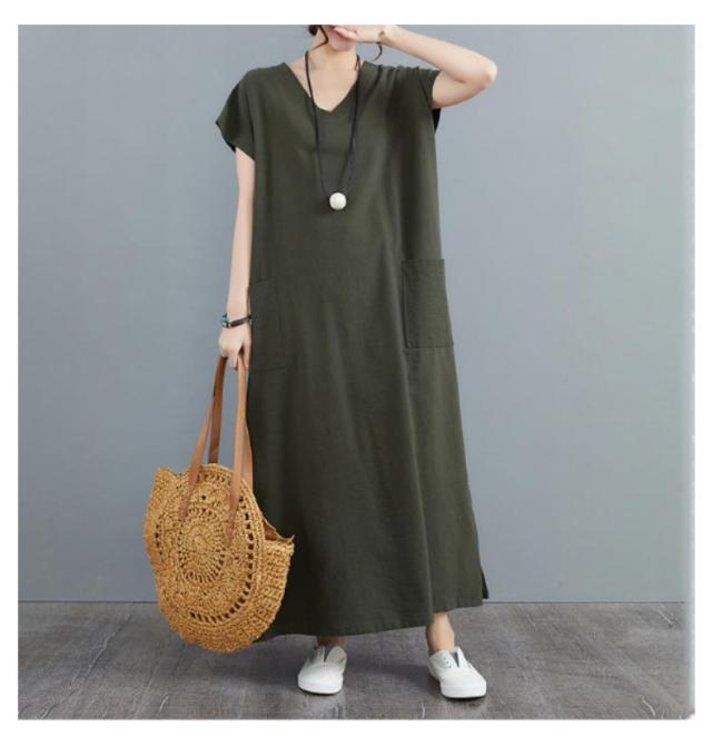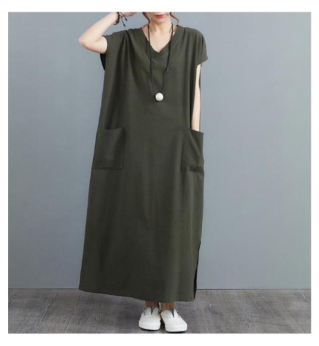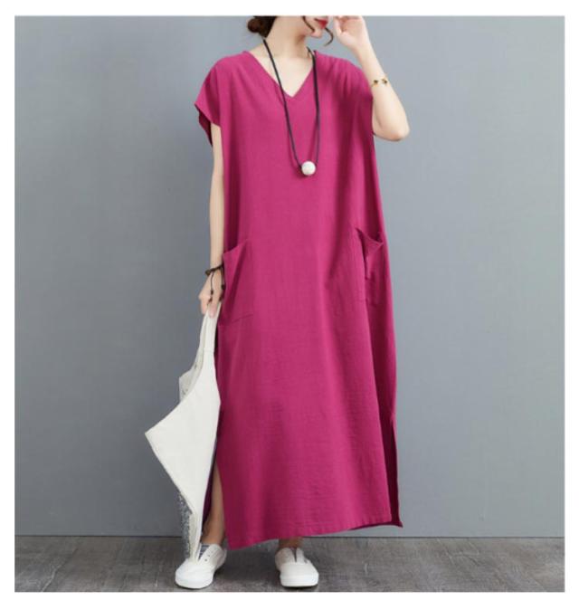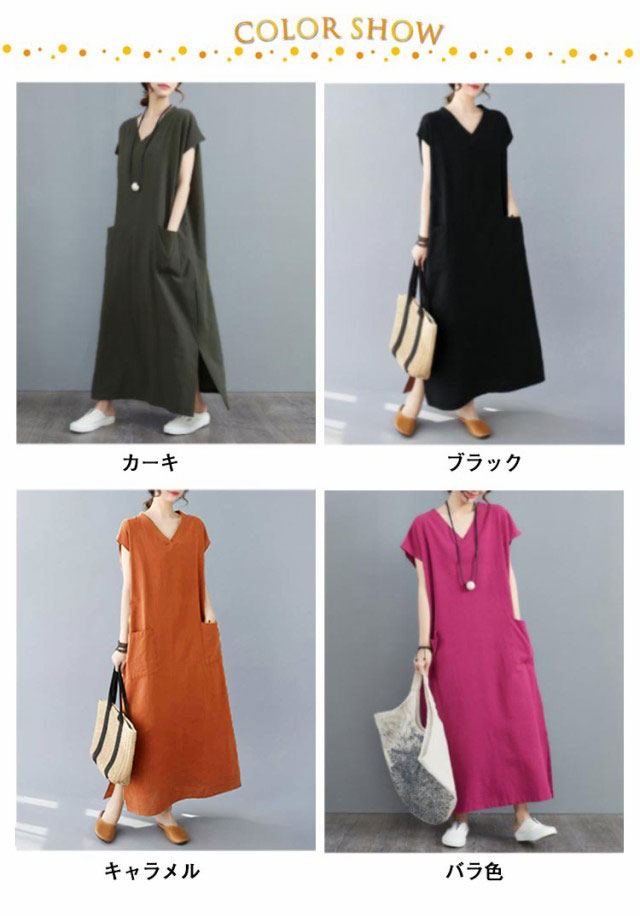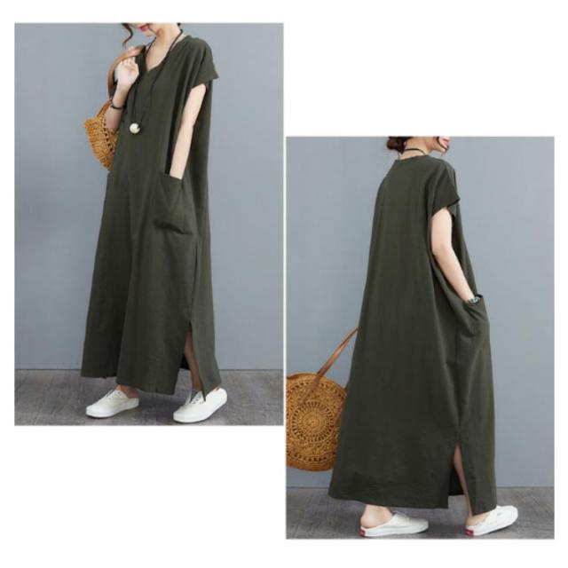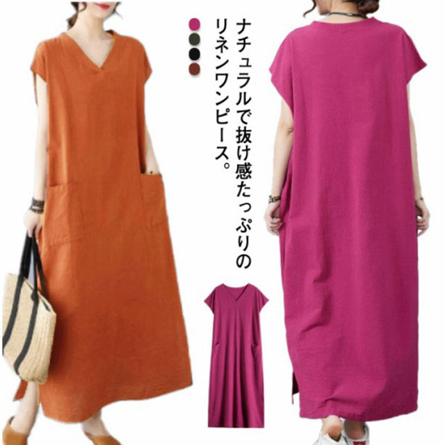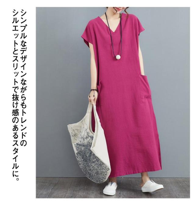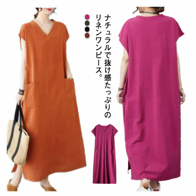 ロングワンピース リネンワンピース 大きいサイズ コットンリネン 涼しい マキシワンピース フレンチスリーブ ワンピース 半袖 Vネック ポケット付き 夏服 新作 スリット入り ゆったり 体型カバー ナチュラル 森ガール
