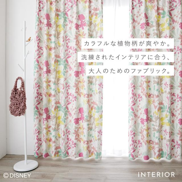 カラフルな植物柄が爽やか。透明感あるミッキーのドレープカーテン。隠れているミッキーマウスのシルエットに癒されます。