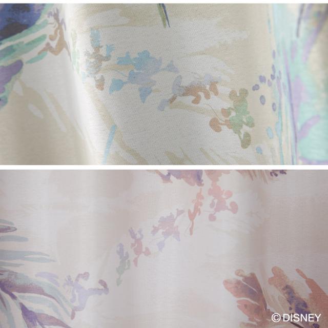 水彩タッチの羽が舞う優しいデザイン。ミッキーの大人可愛いドレープカーテン。よく見ると羽のまわりにミッキーたちの姿が。スモーキーカラーでインテリアにも合わせやすいデザイン。