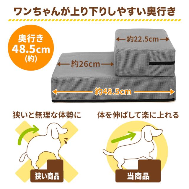 サイズは2段にした場合、1段目の幅が約26cm、2段目の幅が約22.5cmでワンちゃんが体を伸ばして、無理なく上がれる幅になります。