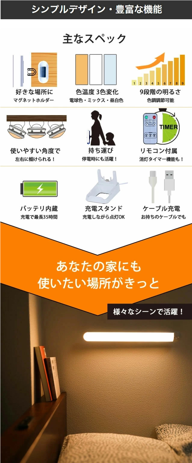ロメッタ 携帯 ルームライト スタンド リモコン付き 充電タイプ 間接照明 LED バーライト 明るさ9段階 ASH-TR-ROM-CBL38 軽量 220g 消灯タイマー 停電 計画停電 勉強机 寝室 クローゼット リビング キッチン 廊下 洗面所 トイレ 玄関 おしゃれ 白 ホワイト agesugi_sis