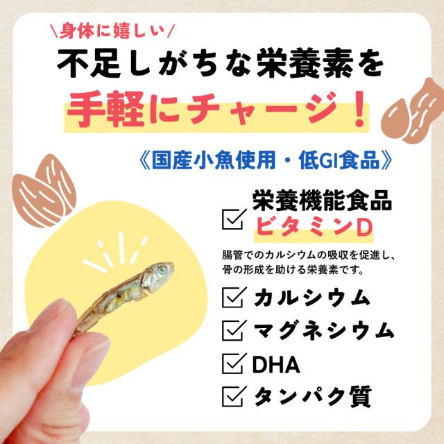 [原材料]アーモンド(アメリカ合衆国)、落花生(アメリカ合衆国)、乾燥いわし(国内)
