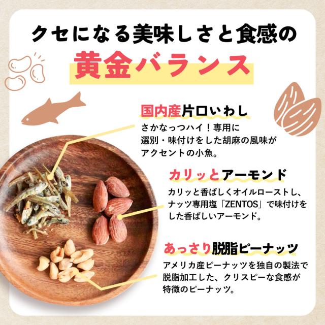 カリッと丸粒アーモンド、メーカー独自のさくさく脱脂ピーナッツ、瀬戸内海産100%のカエリサイズのカタクチイワシ、この組み合わせがなぜかとってもおいしい。