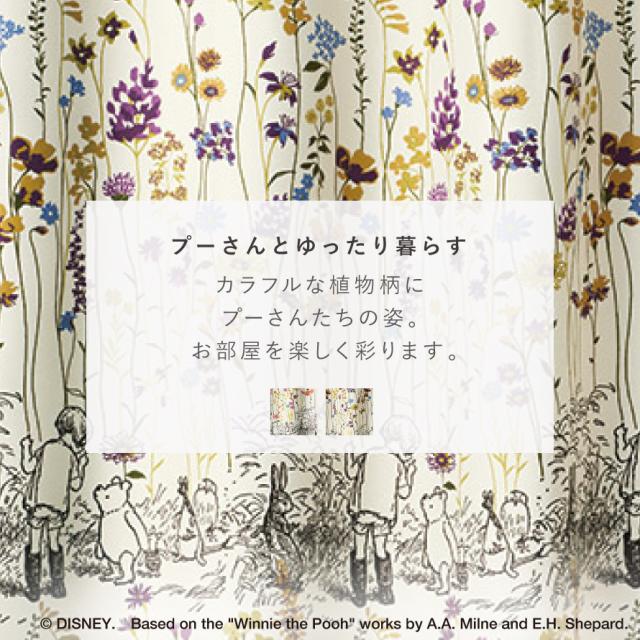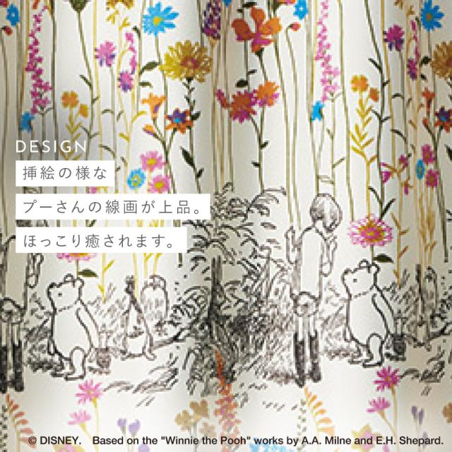 カラフルな植物柄とプーさんが大人可愛いドレープカーテン。鮮やかな花々と線画のプーさんとの対比が上品なデザイン。