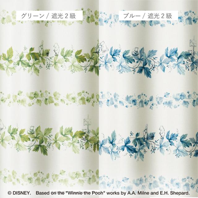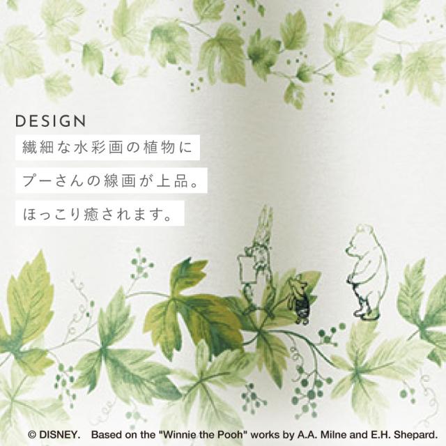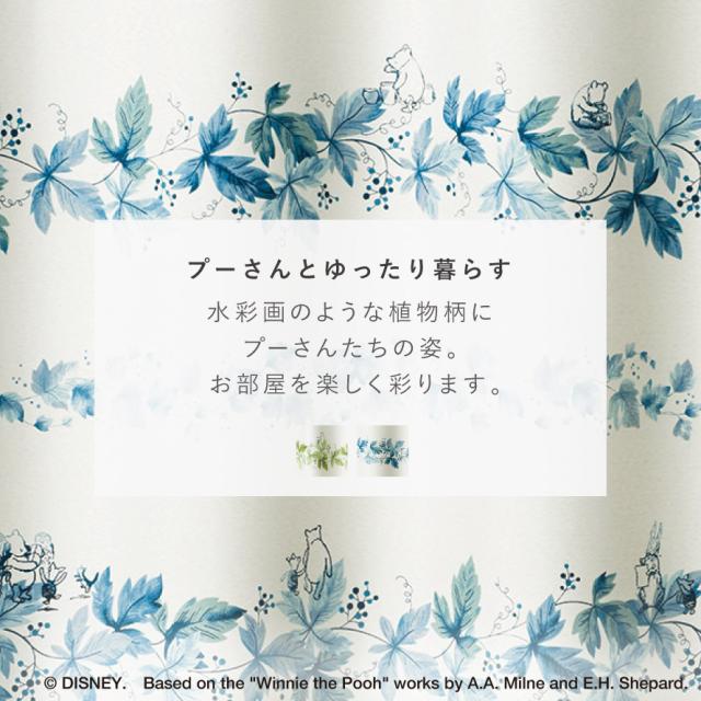 水彩画のような植物柄とプーさんが大人可愛いドレープカーテン。ワントーンカラーでインテリアにも馴染む爽やかなデザイン。