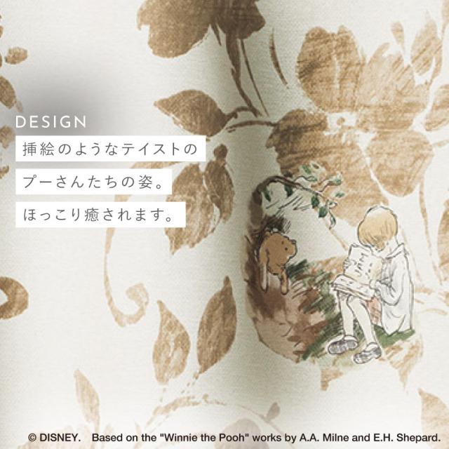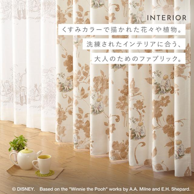 水彩画タッチの植物とプーさんたちが大人可愛いドレープカーテン。挿絵のようなイラストが上品で、インテリアにも馴染むデザインです。