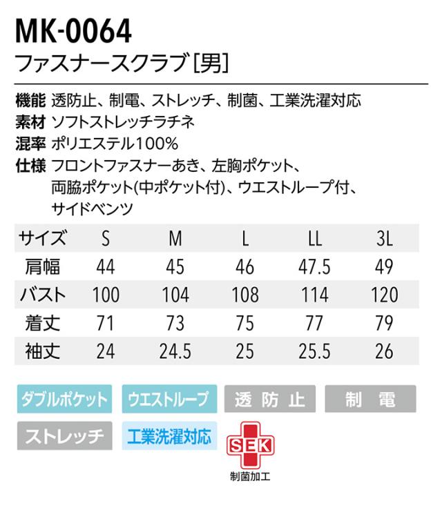 仕様: フロントファスナーあき、左胸ポケット、両脇ポケット(中ポケット付)