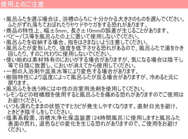 | 使用上の注意 | 使い始めは素材特有のにおいがする場合がありますので、気になる場合は陰干しなど日陰に放置し、ニオイが消えてから使用してください。 手をついたり、乗ったりしないでください。 一部の入浴剤や温泉水によっては変色する場合があります。 レモンなどの柑橘類を使用すると商品を傷めますので使用しないでください。 24時間風呂はフタを傷める恐れがあるため使用は控えてください。 風呂水洗錠剤、浴室用洗剤によってはフロフタが変色したり傷んだりする場合があります。 浴槽のフチに十分かかるか必ずサイズを確認してください。 仕様上、製品サイズには若干の誤差(±10mm以内)が生じます。 樹脂特性により温度によって風呂ふたが反る場合がありますが、冷めると元に戻ります。 |