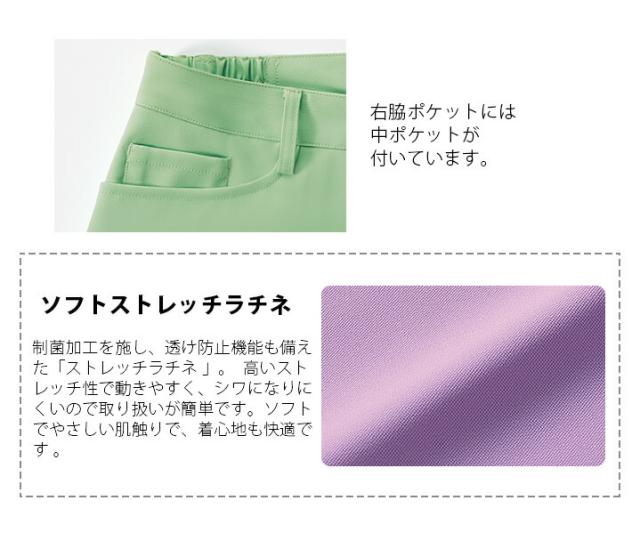 仕様: 前あきファスナー、ウエスト脇ゴム
