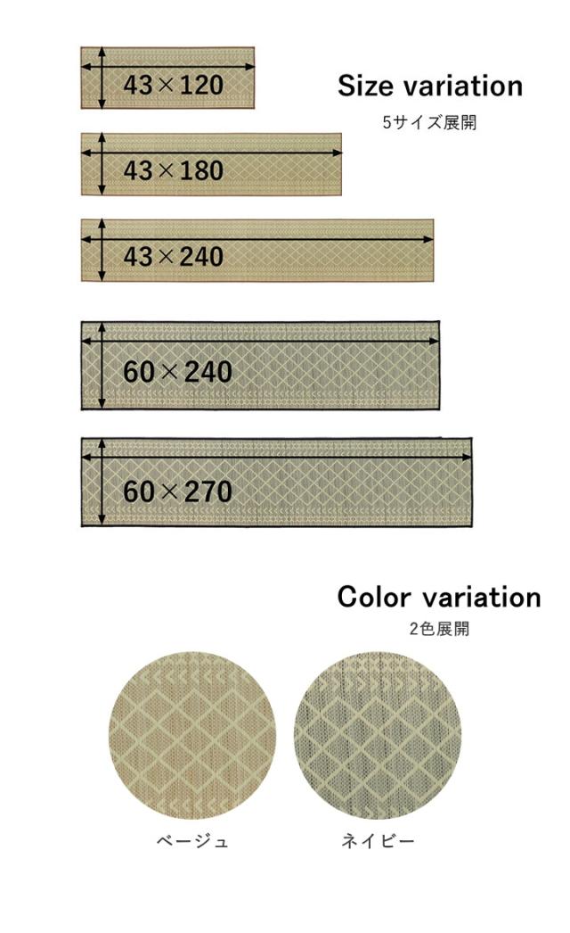 どんなキッチンにも合わせやすいナチュラルな雰囲気のい草キッチンマット。 トレンド柄の幾何柄を取り入れたデザインで、シンプルでオシャレなキッチンに仕上がります。 表面はい草特有の素足にもやさしいさらっとした肌触り。 また、生地表面には青森県のヒバの木から抽出した「ヒバエッセンス」をメーカー独自の技術で加工しました。 ヒバエッセンスにはヒノキチオールという天然物質が含まれており、抗菌防臭効果があります。 裏地には国産のウレタンフォームを使用しているため、丈夫でクッション性がありすべりにくい仕様です。 ベージュ、ネイビーの2色からお選びください。 ※ネイビーはブラックに近い色味です。 ※選択肢で表示される画像はイメージのため、実際のサイズとは異なる場合がございます。 キッチンの大きさ・広さに合わせやすい5サイズ展開です。 ■い草のキッチンマット カランの他サイズはこちら↓ 【43×120cm】 【43×240cm】 【60×240cm】 【60×270cm】 ■その他のキッチンマットはこちら↓ キッチンマット一覧 |