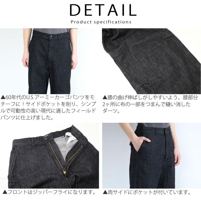 カーゴパンツで重要なサイドポケットを削り、シンプルで可動性の高い現代に適したフィールドパンツに仕上げました。