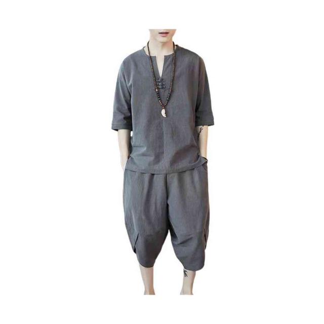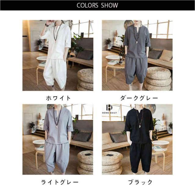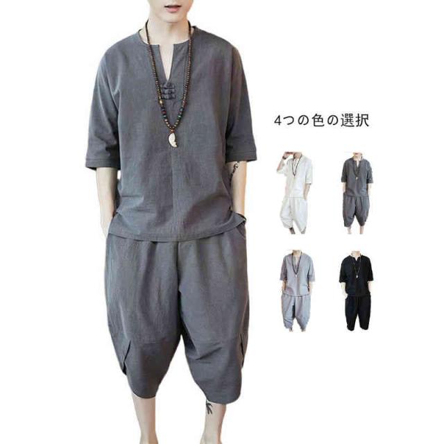 セットアップ 上下セット 甚平 メンズ 春夏 涼しい vネック ゆったり トップス リネン カジュアルパンツ 普段着 部屋着 リネン服 送料無料 2点セット 半袖 パンツ 男性用