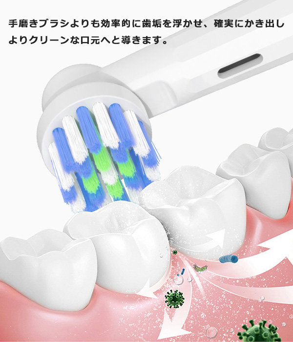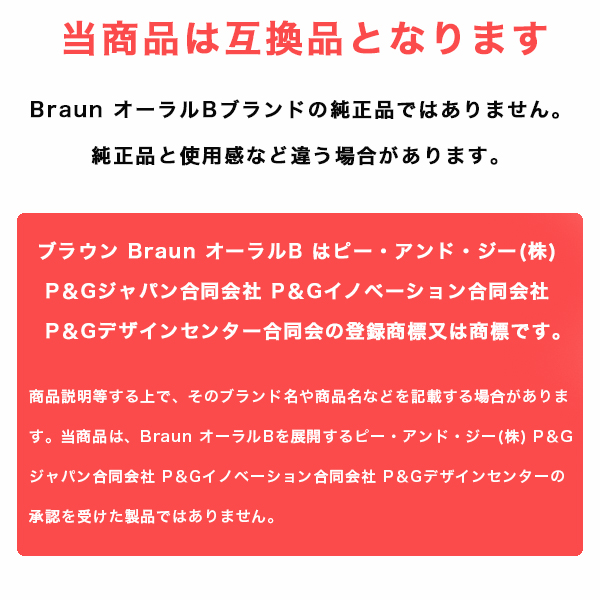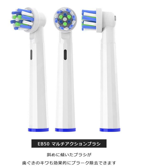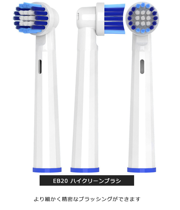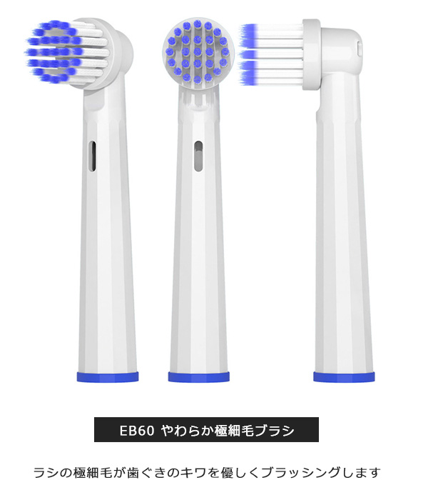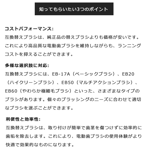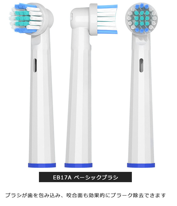 | 商品説明 | 【互換替えブラシで、もっと気軽に電動歯ブラシを楽しもう!】 ブラウン オーラルB の電動歯ブラシは、その高性能で知られていますよね。けど、純正の替えブラシが少々お高めなのも事実。 そんな時に登場するのが、これらの互換替えブラシなんです。 【互換替えブラシの魅力は?】 「純正じゃないとダメだよね?」と思うかもしれませんが、そんな心配は無用。互換替えブラシは純正と同等の品質を持ちつつ、価格はお財布に優しく、また種類も豊富なんです! 例えば、基本的なブラッシングをしっかりとこなす EB-17Aのベーシックブラシ、細部までしっかりと磨きたい方には EB20のハイクリーンブラシ、 ブラッシングに慣れてきた方にはEB50のマルチアクションブラシなど、自分の好みやライフスタイルに合わせて選べます。 ちなみに、敏感な歯茎の方にはEB60のやわらか極細毛ブラシがオススメです。 しかも、取り付けは簡単!歯茎を傷つけることなく、しっかりと歯垢を落としてくれます。8本セットでの販売なので、しっかりとストックしておけば、急なブラシ交換も安心ですね。 【EB-17A:ベーシックブラシ】 しっかりとしたブラッシングが可能な基本タイプのブラシです。 ブラシの設計が歯を包み込むようになっていて、咬合面だけでなく歯の隅々まで効果的にプラークを除去します。手軽さを求める方にぴったりです。 【EB20:ハイクリーンブラシ】 こちらは細部までケアしたい方におすすめのブラシです。 より細かく精密なブラッシングが可能で、歯間や歯と歯ぐきの間、歯の裏面まで、見えにくい部分のケアもしっかりとサポートします。 【EB50:マルチアクションブラシ】 このブラシは、斜めに傾いたブラシが特徴で、 歯ぐきのキワまで届く設計になっています。通常のブラッシングだけでなく、歯ぐきまわりのケアも重視する方に適しています。 【EB60:やわらか極細毛ブラシ】 敏感な歯茎を持つ方、または歯ぐきのケアを特に重視する方にはこのブラシがおすすめです。 ブラシの極細毛が歯ぐきのキワを優しく、しかし効果的にブラッシングします。このブラシなら、快適なブラッシング体験を得られます。 品質は純正と変わらず、価格もお手頃。さらに種類も豊富で、あなたの歯ブラシライフがもっと楽しく、もっと身近になること間違いなしです。 これを機に、ぜひ互換替えブラシを試してみてください 【商品詳細】 素材・POM 本数・同タイプ8本SET ブラウン Braun オーラルB はピー・アンド・ジー(株) P&Gジャパン合同会社 P&Gイノベーション合同会社P&Gデザインセンター合同会の登録商標又は商標です。 商品説明等する上で、そのブランド名や商品名などを記載する場合があります。当商品は、Braun オーラルBを展開するピー・アンド・ジー(株) P&Gジャパン合同会社 P&Gイノベーション合同会社 P&Gデザインセンターの承認を受けた製品ではありません。 【注意事項】 ※本商品には説明書が付属しておりません。使用方法に関しては商品ページをご参照ください。 ※商品画像はご覧になっているモニターやPCなどの環境、解像度により、実物と多少カラーが異なる場合がございます。色味やサイズが異なるなどのクレームはご対応致しかねますので、予めご了承ください。 ※輸送中に外装に傷やへこみが起こる場合がございますが、商品に影響はございませんので、予めご了承のもとお買い求めください。 ※本商品は海外からの輸入品ですので、細かい傷や汚れなどある場合がございます。予めご了承のもとお買い求めください。 ※こちらの商品は安価にご提供するため、簡易包装、簡易パッケージとなっております。 ※製造上、細かい汚れなどが付着している場合がございますので、濡れた布巾や、ウェットティッシュなどで拭き、よく乾かしてからご使用ください。 ※本商品は長い棒状になっており、立ったままのご使用、安全でない環境で使用されますと怪我、事故の恐れがありますので、お取り扱い時は十分に注意してご使用ください。 ※お子様の使用は怪我の原因となりますので、手の届かない場所にて保管頂き、ご使用はお控えください。 ※本商品を使用した事による、直接もしくは間接的に生じた怪我、事故、損害について当店は一切の責任を負いません。 ※本商品は消耗品です。毛先の開き、柄の部分が割れたり、ひびが入った場合は怪我、事故の原因となります。異常があった場合はすぐにご使用を控え、新しく交換してください。 ※柄の部分を過度に曲げると破損し怪我、事故になる恐れがありますので、ご注意ください。 ※本商品をご使用時、強い力で磨きますと、口内、歯茎、歯の怪我、事故の原因となります。ご使用時は優しく磨き、安全に配慮してご使用ください。 ※本商品は歯を磨くために作られており、歯を磨くこと以外には使用しないでください。 ※ご使用後は流水でよく洗い流し、水気を切った後、風通しの良いところで保管して下さい。菌の増殖や、カビの原因