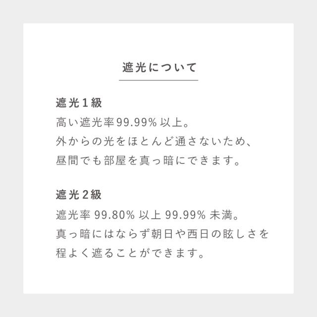 遮光率99.80%以上99.99%未満。真っ暗にはならず、朝日や西日のまぶしさを程よく遮ることができます。寝室に取り付けると、朝日をやんわりと浴びて自然な光で気持ちよく目覚めることができます。紫外線をブロックし、肌やフローリング、家具を日焼けから守ります。外からの気になる視線を遮断しプライバシーを守ります。