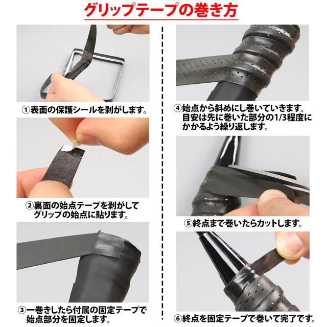 ・グリップテープ自体には始点以外貼り付けテープはついてないので、必ず固定テープで始点と終点を固定してください。しっかりグリップに巻き付けていないと部分的に解けることがあります。