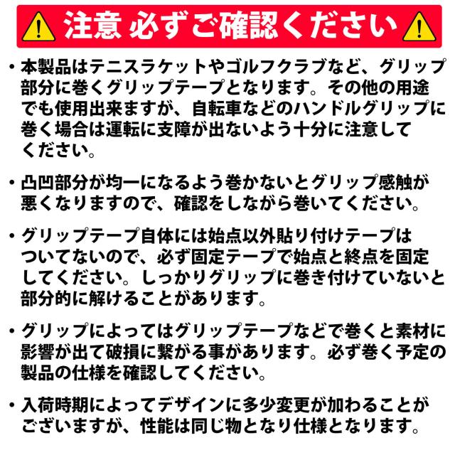 ・本製品はテニスラケットやゴルフクラブなど、グリップ部分に巻くグリップテープとなります。その他の用途でも使用出来ますが、自転車などのハンドルグリップに巻く場合は運転に支障が出ないよう十分に注意してください。
