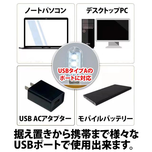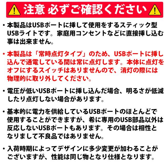 ・本製品はUSBポートに挿して使用をするスティック型USBライトです。家庭用コンセントなどに直接挿し込む事は出来ません。