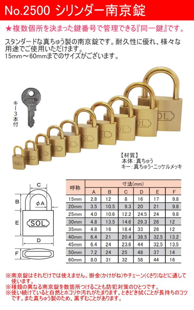 SOLHARD No.2500 シリンダー南京錠 30mm 同一鍵定番 防犯 防犯グッズ 真鍮 真ちゅう 同一鍵 ネコポス対応