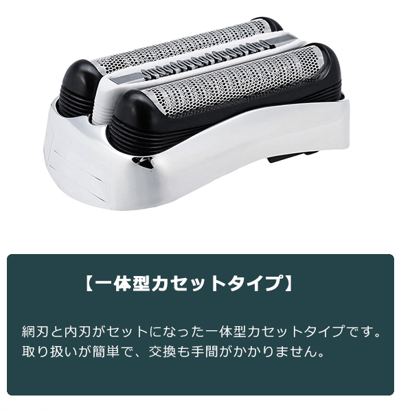 網刃と内刃がセットになった一体型カセットタイプです。取り扱いが簡単で、交換も手間がかかりません。