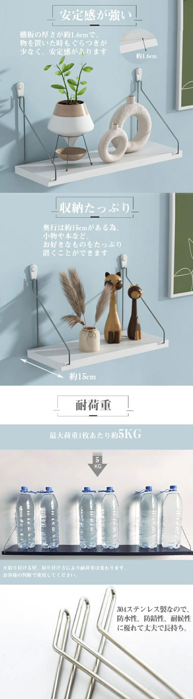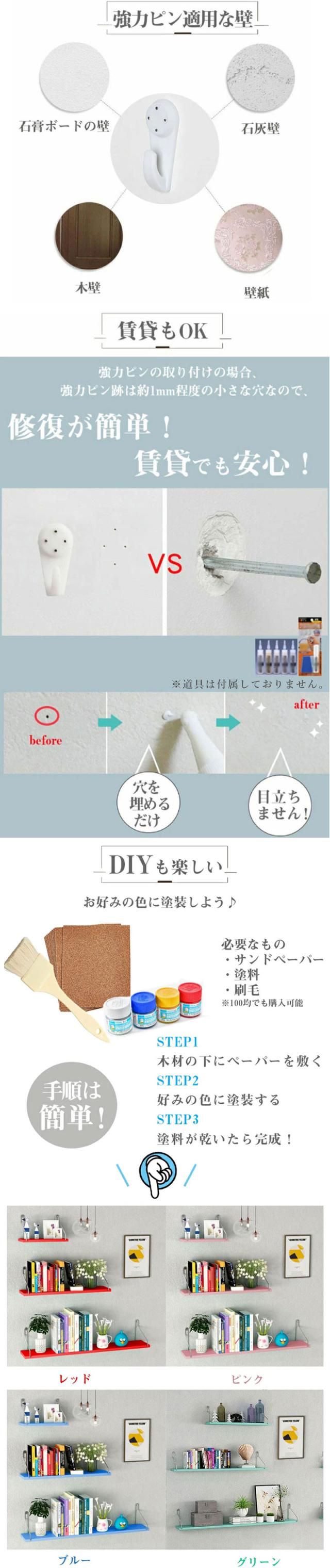 | セット 内容 | 棚板×3 拡張ネジ×6 強力ピン×6 ワイヤー×6 水準器 |